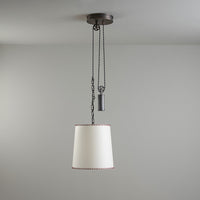 Rise is an adjustable pendant light that is able to generate different moods and effects within a room. Pulleys and counterweights allow the shade to be easily raised or lowered in order to cast an intimate glow on a tabletop or provide more dispersed illumination.
