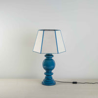 Hourglass Ceramic Table Lamp Base in Blue, With Townhouse Hexagonal Lamp Shade in Soft White with Peacock Blue Trim & Stitching - Nicola Harding