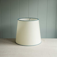 Elegant and versatile, our Large Rise shade is brought to life by an intricately stitched edge made from peacock blue suede. The natural parchment card is smooth to the touch and produces a charming sense of movement when light shines through it.