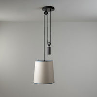 Rise is an adjustable pendant light that is able to generate different moods and effects within a room. Pulleys and counterweights allow the shade to be easily raised or lowered in order to cast an intimate glow on a tabletop or provide more dispersed illumination.
